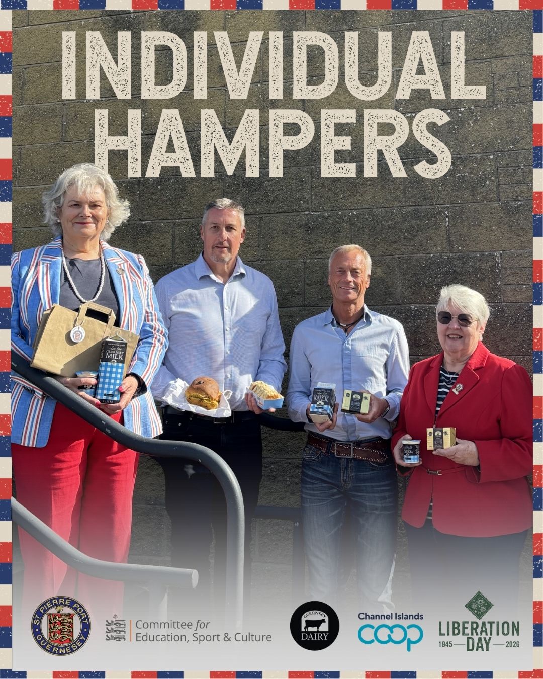 The hampers will include scones, orange cake, Guernsey Gache, tea, jam, dairy products donated by Guernsey Dairy and fruit donated by the Co-operative. Each hamper will be accompanied by a traditional ration card.